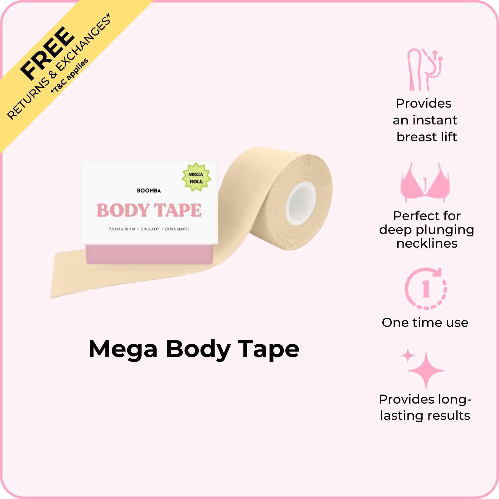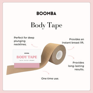 Ang Body Tape ng BOOMBA ay maaaring isuot sa iba't ibang paraan. Dinisenyo upang iayon sa iyong mga hugis, ang aming body tape e ay banayad ngunit matibay, na nagbibigay ng pangmatagalang mga resulta para sa hanggang sa 12 oras.
