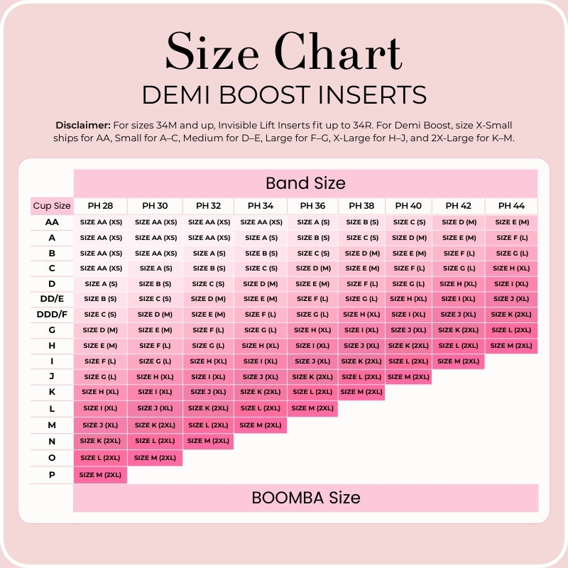 Para sa Demi Boost, ang size X-Small ang ipapadala para sa size AA. Ang size Small ang ipapadala para sa sizes A, B, at C. Ang size Medium ang ipapadala para sa sizes D at E. Ang size Large ay ipapadala para sa sizes F at G. Ang size Extra-Large ang ipapadala para sa sizes H, I, at J, at ang size 2Extra-Large ang ipapadala para sa sizes K, L, at M.