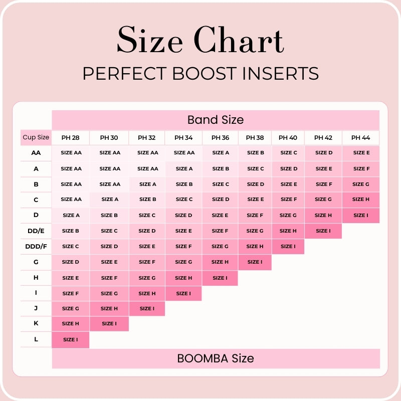 Para sa mga sizes na 34I pataas, available ang aming Demi Boost Inserts (double push-up) hanggang size 34M at ang aming Invisible Lift Inserts (lightly padded) ay available hanggang size 34R.