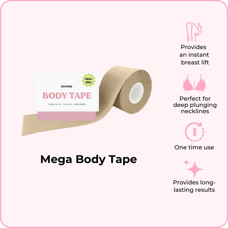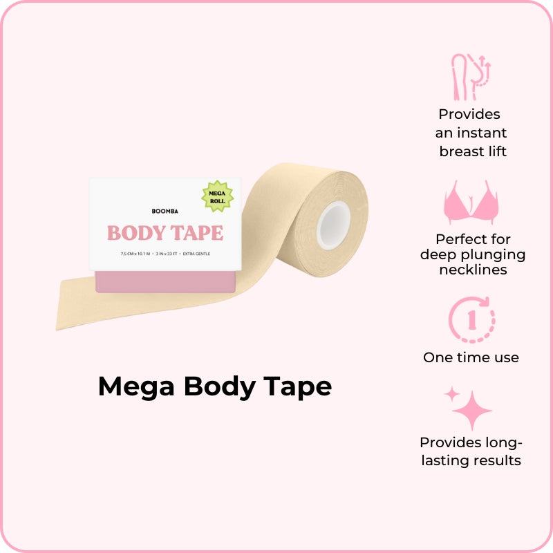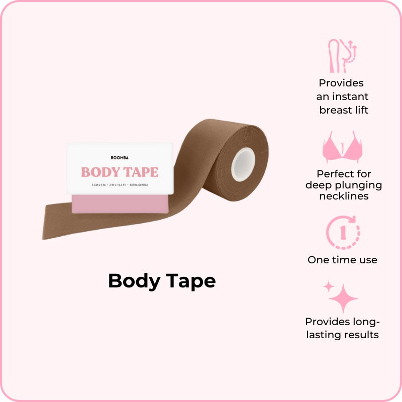Ang Body Tape ng BOOMBA ay maaaring isuot sa iba't ibang paraan. Dinisenyo upang iayon sa iyong mga hugis, ang aming body tape e ay banayad ngunit matibay, na nagbibigay ng pangmatagalang mga resulta para sa hanggang sa 12 oras.