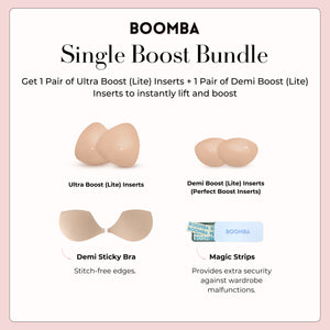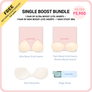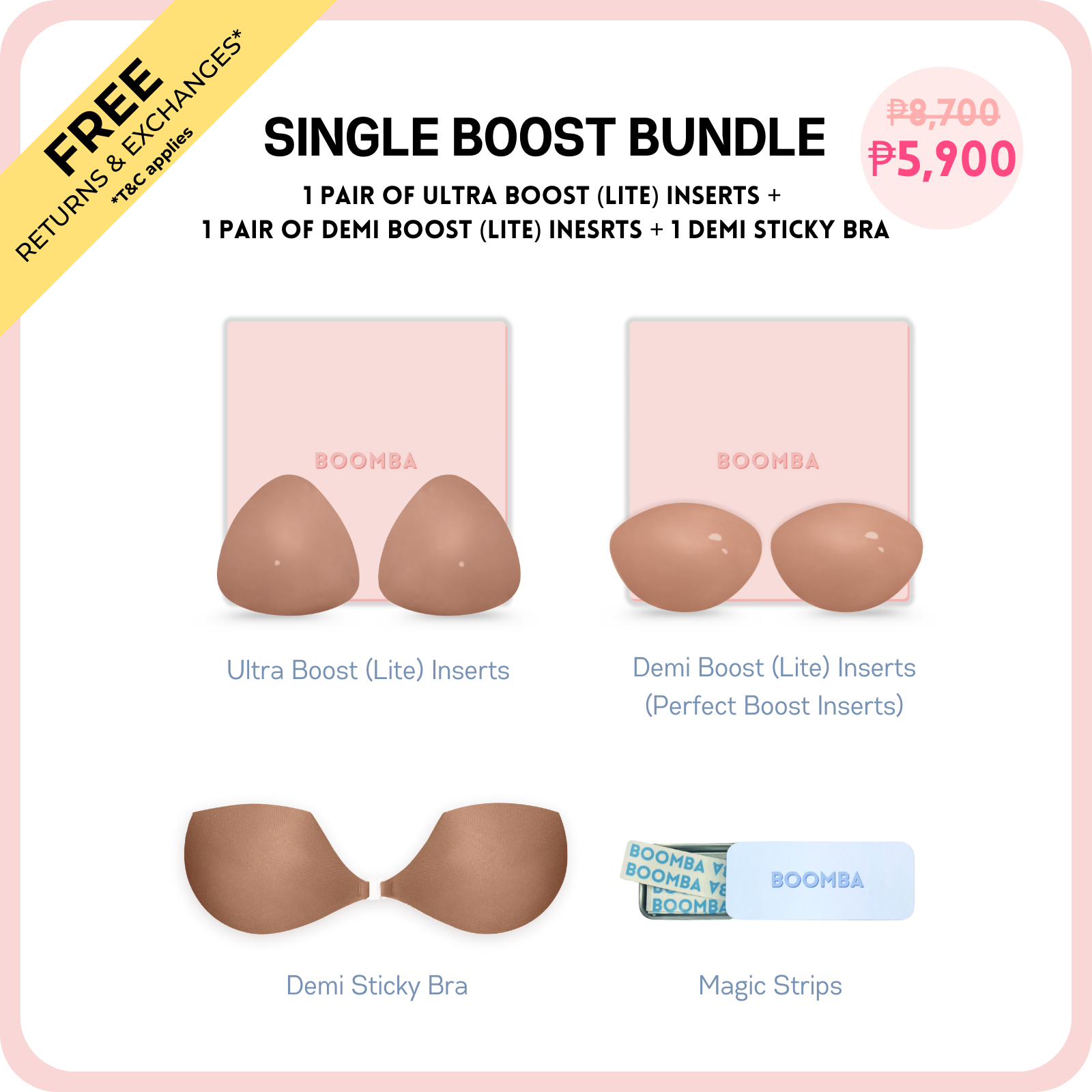 Looking for a natural-looking boost? Our Single Boost Bundle is perfect for you! It features the thinner versions ng aming best-selling Ultra Boost and Demi Boost Inserts. These Lite versions still give a noticeable lift and boost, pero without the extra padding. Instantly add up to one cup size for a natural, everyday enhancement. Perfect kapag gusto mo ng boost na low key pero still high impact.
